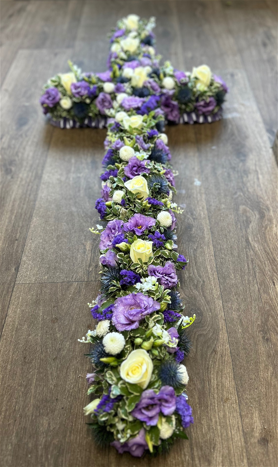 A graceful and timeless cross-shaped floral tribute, crafted from a beautiful mix of seasonal flowers and edged with a ribbon in the colour of your choice.