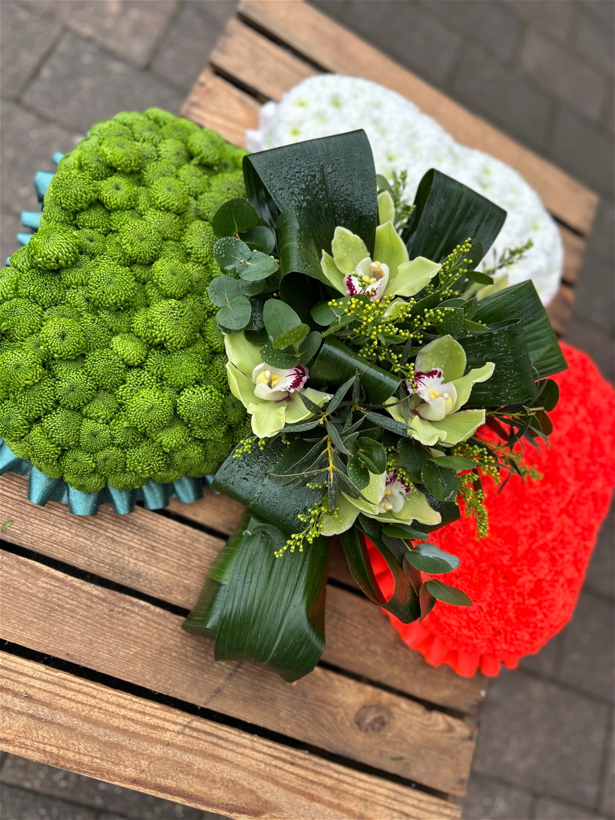 Designed in the iconic three-leaf shamrock shape, each leaf is expertly formed using textured blooms in rich green, pure white, and orange.Creating a bold and meaningful display.