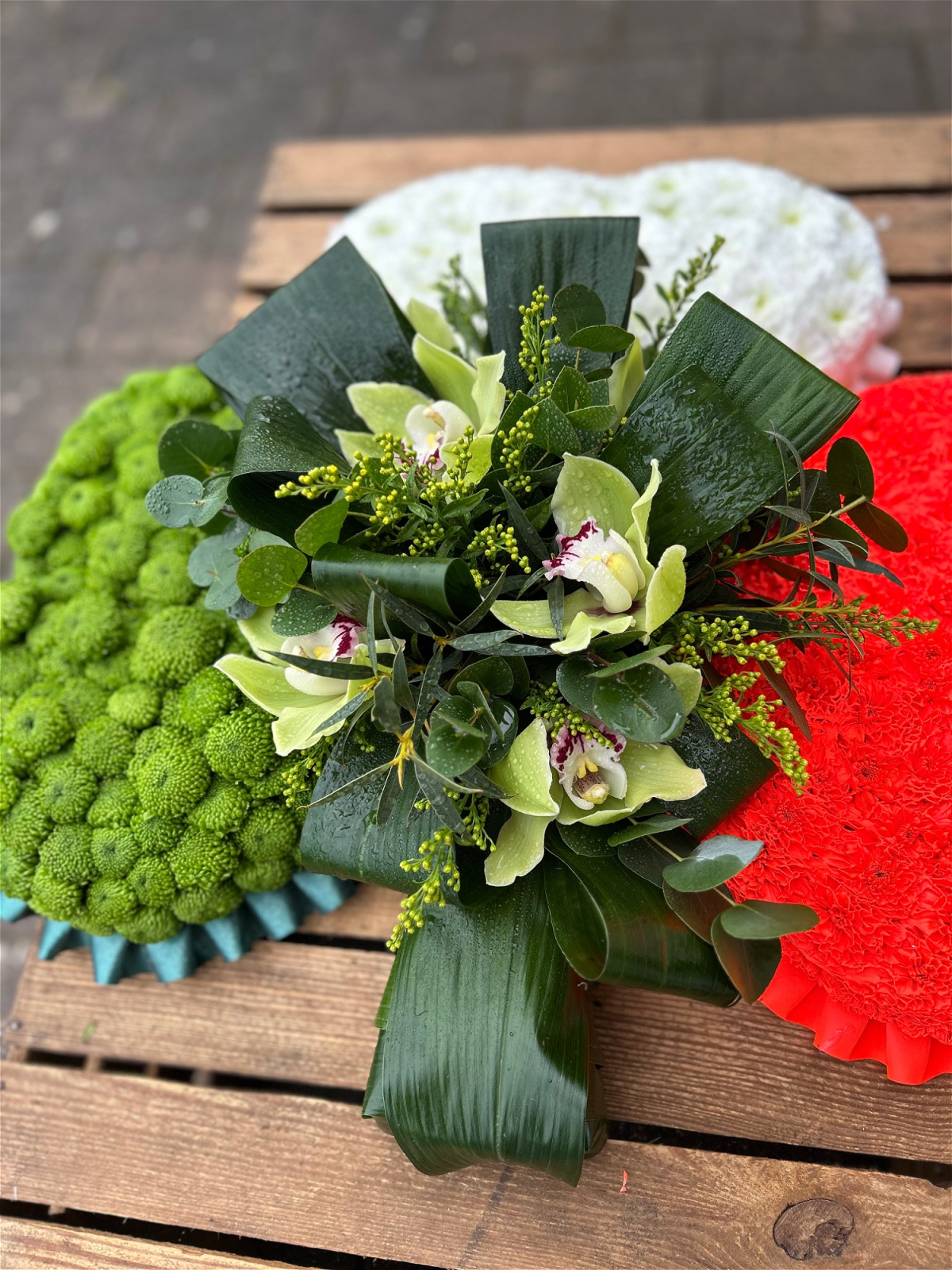 The contrast between the structured shamrock design and the soft, intricate centrepiece makes this tribute truly distinctive.